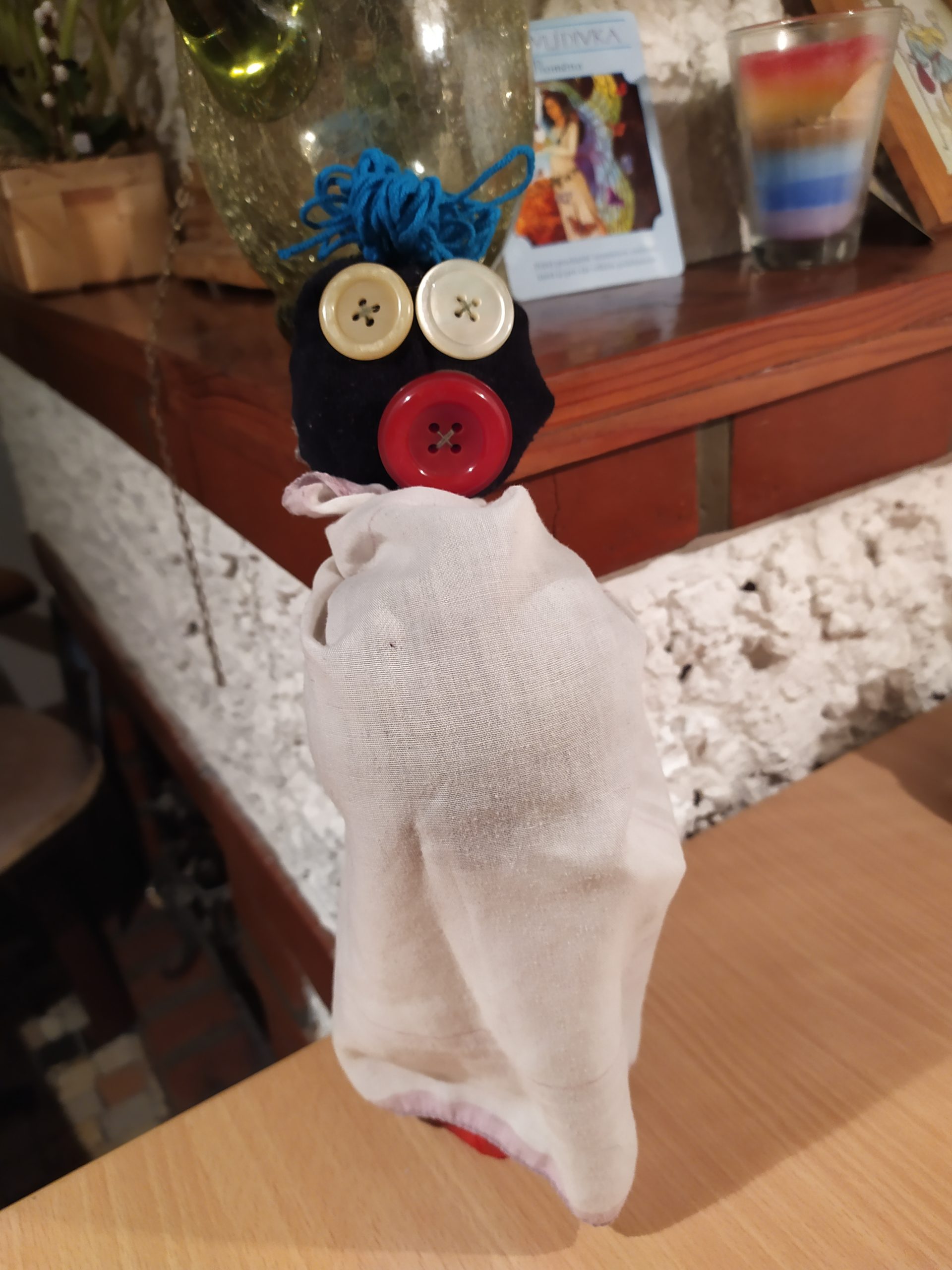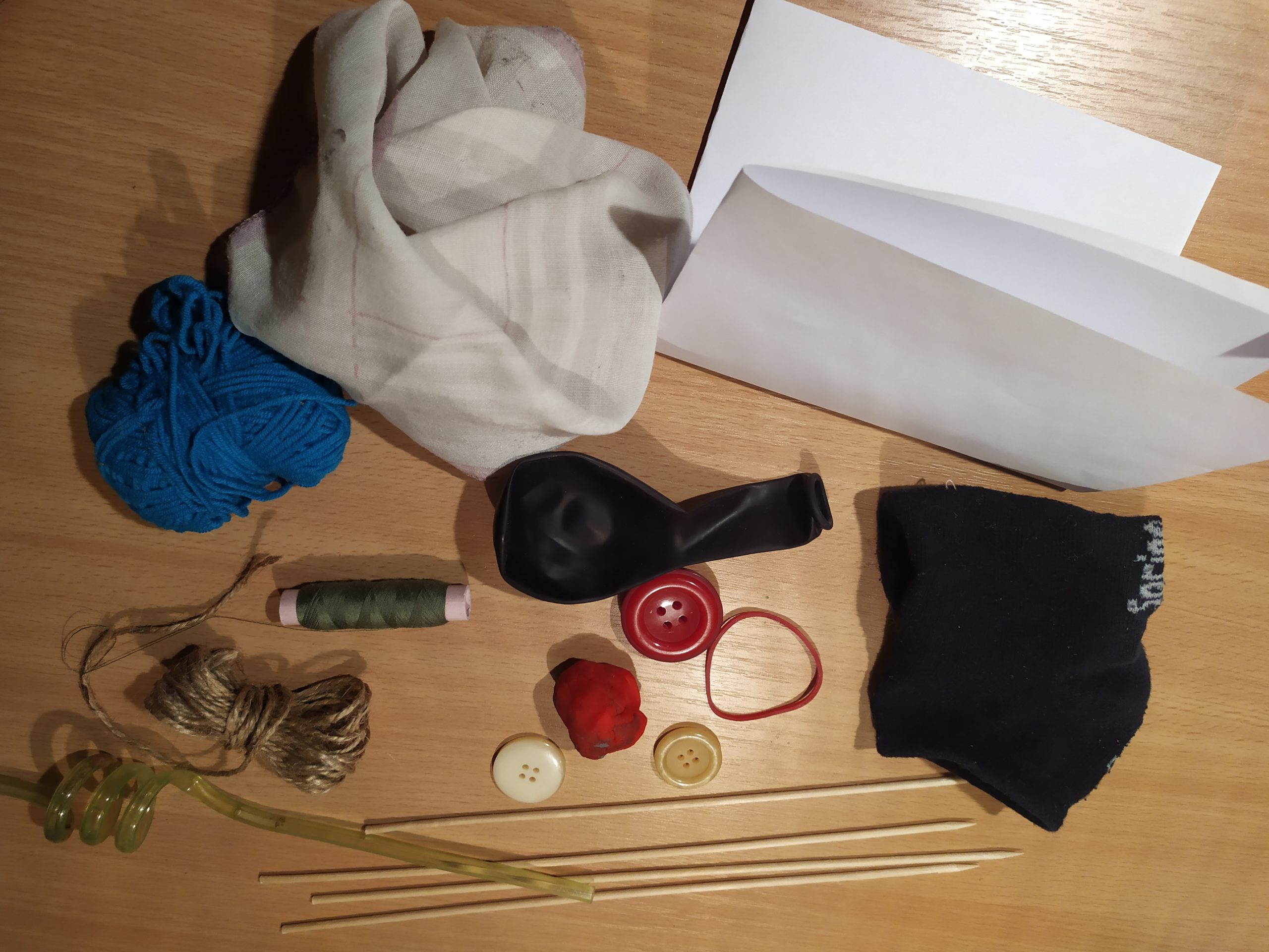 – 1x starou ponožku, brčko, gumičku, kousek provázku, 4 špejlata, zbytek vlny, 1x bavlnku nebo nit, látkový kapesník nebo kousek látky, nafukovací balónek (není povinný, pokud nemáš nevadí :-), 1x list papíru (může být i pokreslený), 3 x knoflík, kousek modelíny