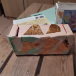 Vezmeš si třeba krabičku od čaje a polepíš ji barevným papírem. Nemáš doma barevný papír? Možná vám od vánoc zbyly kousky různých balících papírů – můžeš použít ty. Hezky vypadá, když je natrháš na kousky a pak ty kousky lepíš lepidlem na krabičku.
