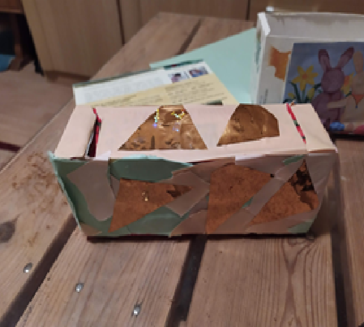 Vezmeš si třeba krabičku od čaje a polepíš ji barevným papírem. Nemáš doma barevný papír? Možná vám od vánoc zbyly kousky různých balících papírů – můžeš použít ty. Hezky vypadá, když je natrháš na kousky a pak ty kousky lepíš lepidlem na krabičku.