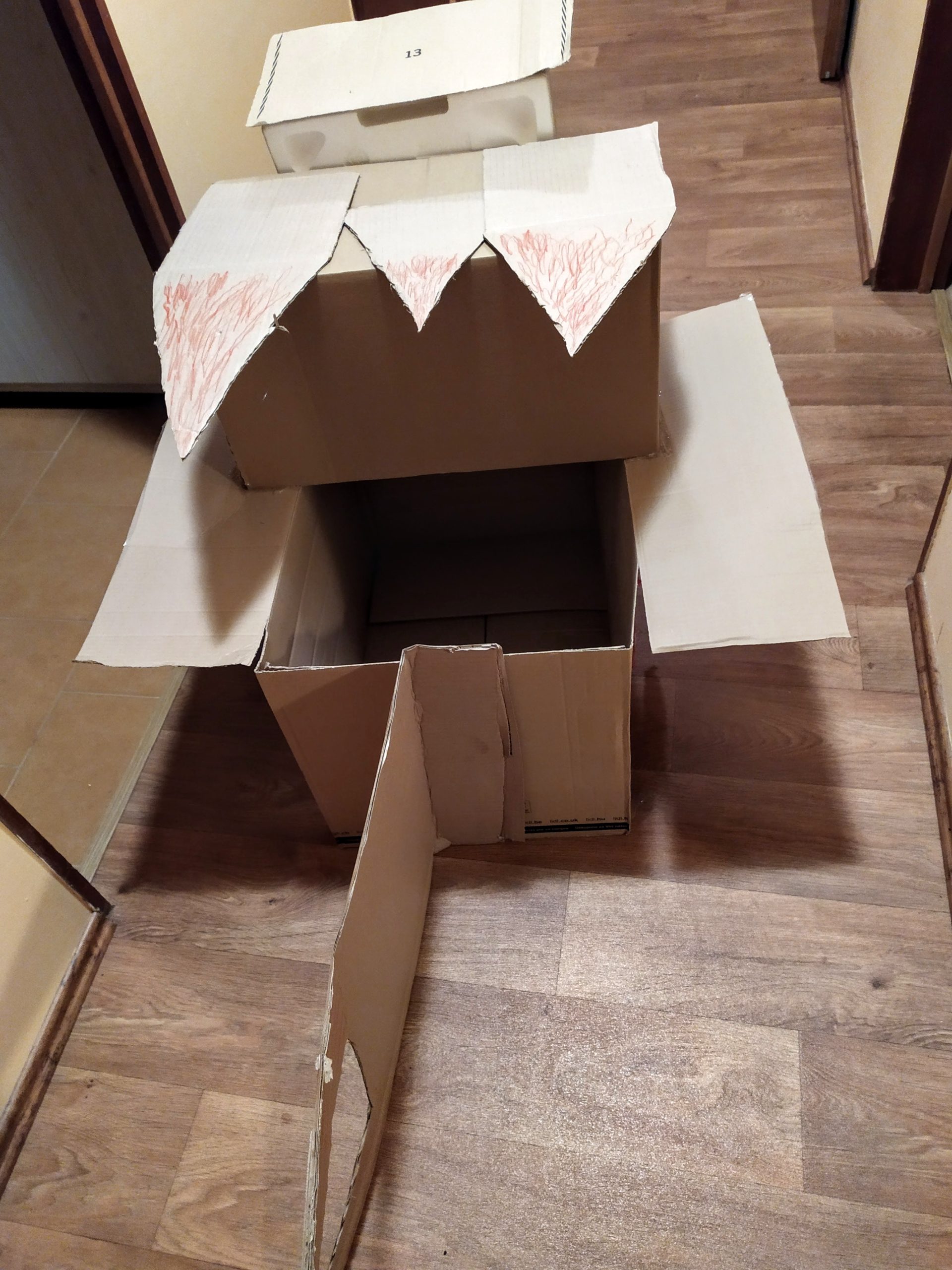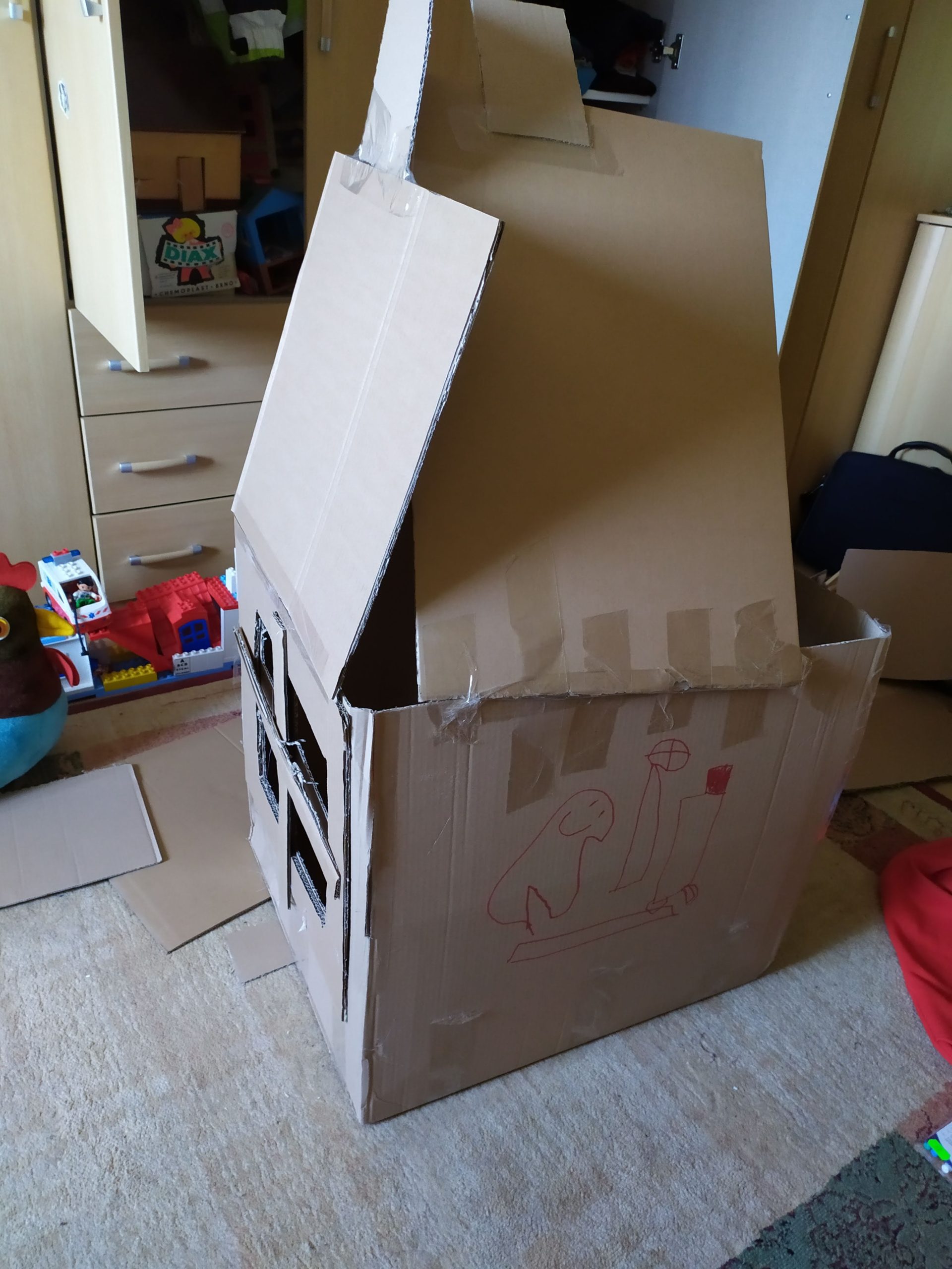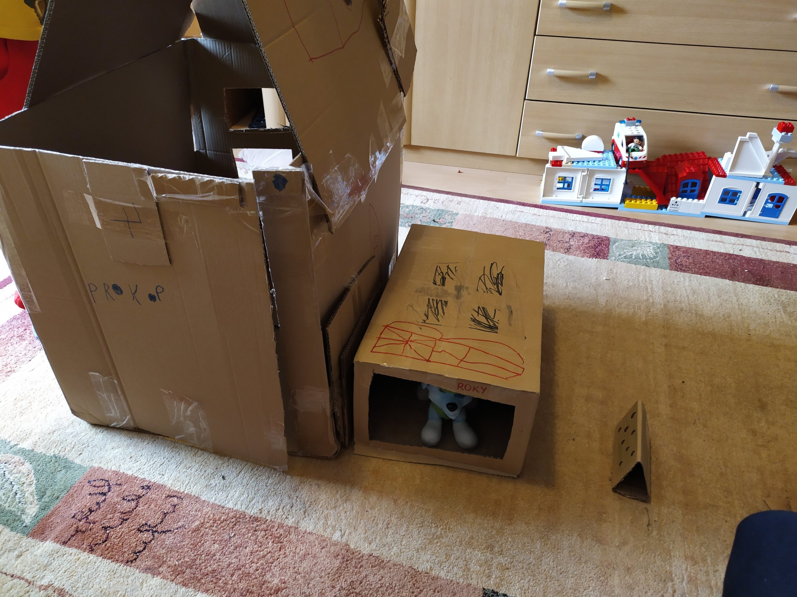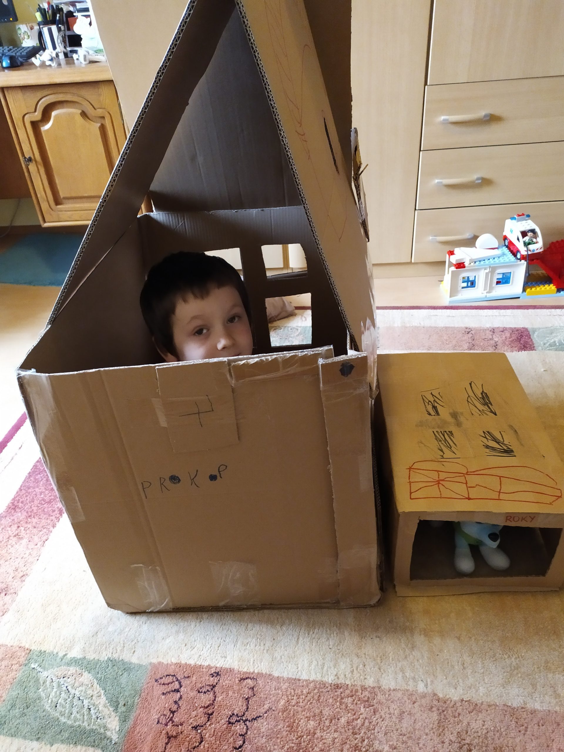 My našli velikou krabici, ze které vznikl dům. Postupně přibyla psí bouda a nakonec okap, který je zároveň kuličkodráhou. Z velké krabice může být také raketa.