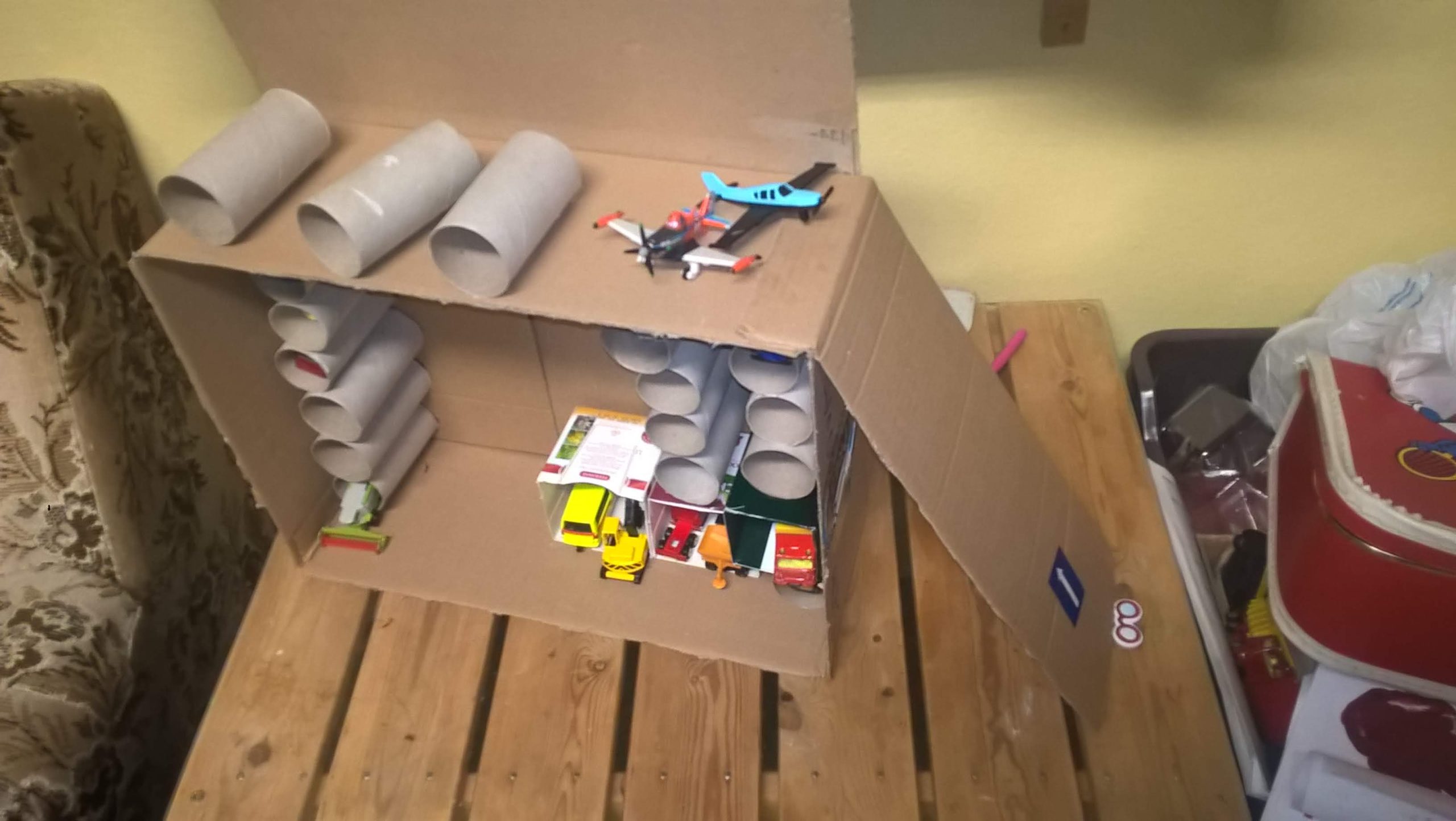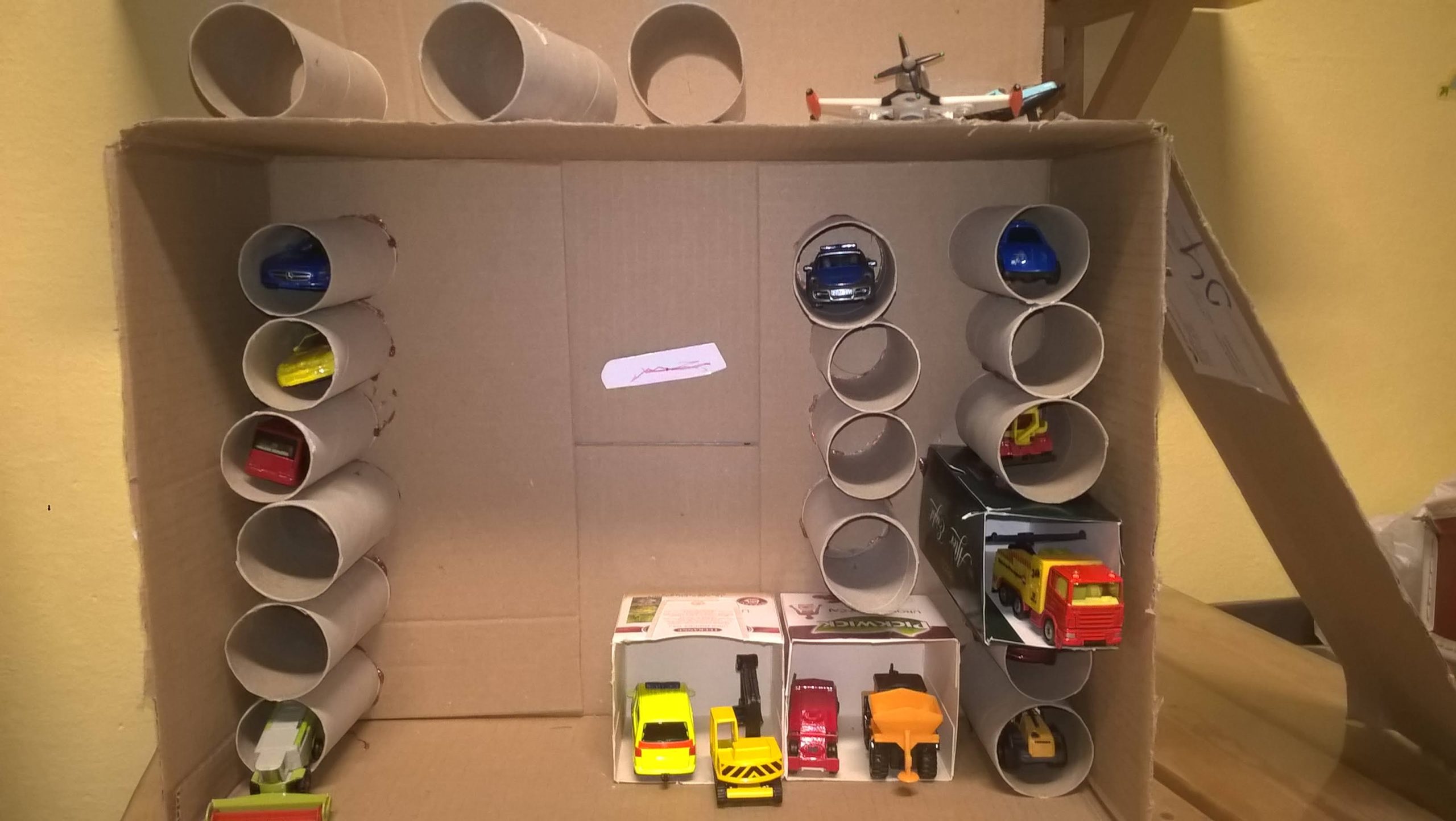 Ze středně velkých krabic se dobře vyrábějí různé garáže – když vlepíte ruličky od toaletního papíru, máte bezvadný parkovací dům.